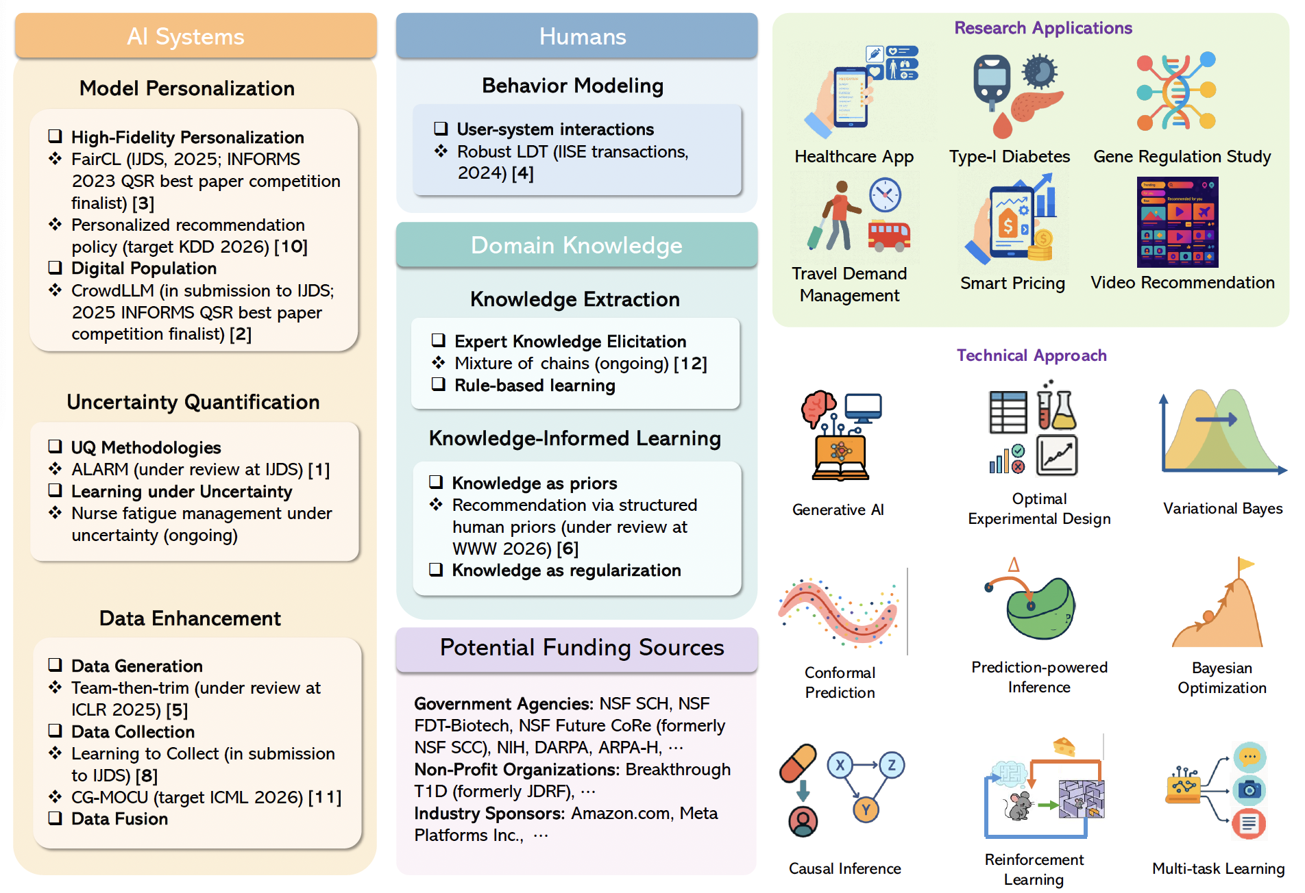 My research is interdisciplinary and lies at the intersection of artificial intelligence (AI), statistics, and quality science, with applications spanning healthcare, medicine, transportation, marketing, etc. I have been collaborating with researchers from both academia and industry across the United States, Europe, and Asia. I was also fortunate to work at Meta as a full-time AI researcher for one year, supported by a generous Meta AI Fellowship, and gained precious experience of cutting-edge AI research and their applications in the real-world. My research works that focused on AI model personalization, human diversity and behavior, their relevance with LLMs and generative AI, have been selected as finalists in the Best Paper Competition of INFORMS Quality, Statistics, and Reliability (QSR) Section in 2023 and 2025. A summary of my research is demonstrated in the overview figure.